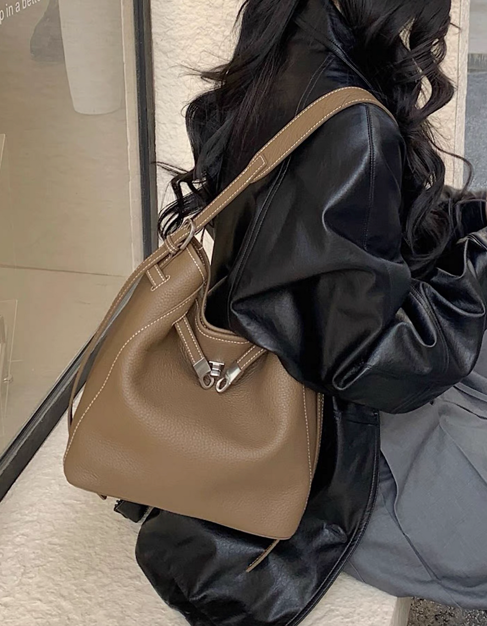Multi partitions boxy bucket togo calf leather handle + crossbody bag