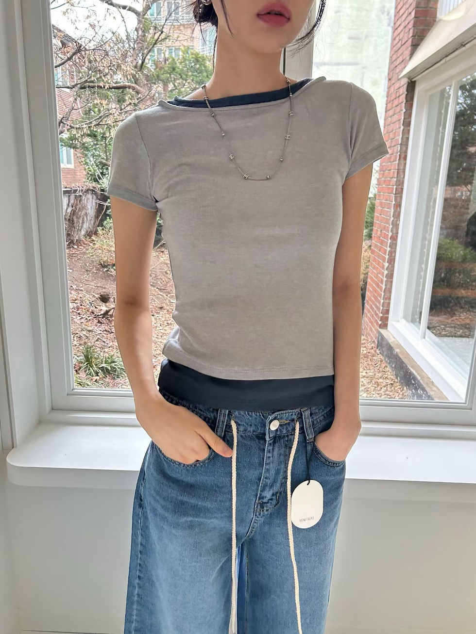 Tencel poly linen ribbed ruffle trim sleeves U neck tee