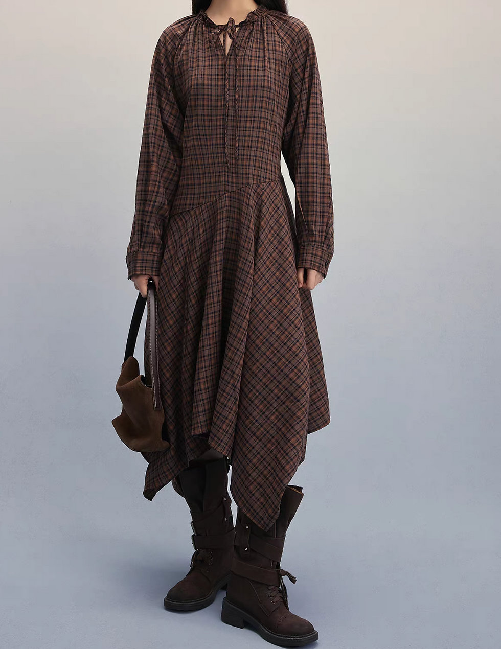 Asymmetric brick navy checker drawstring cotton linen rayon dress