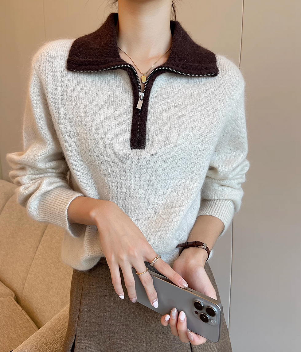 Bicolor zipper wool rayon knitted zipper beige brown knitwear