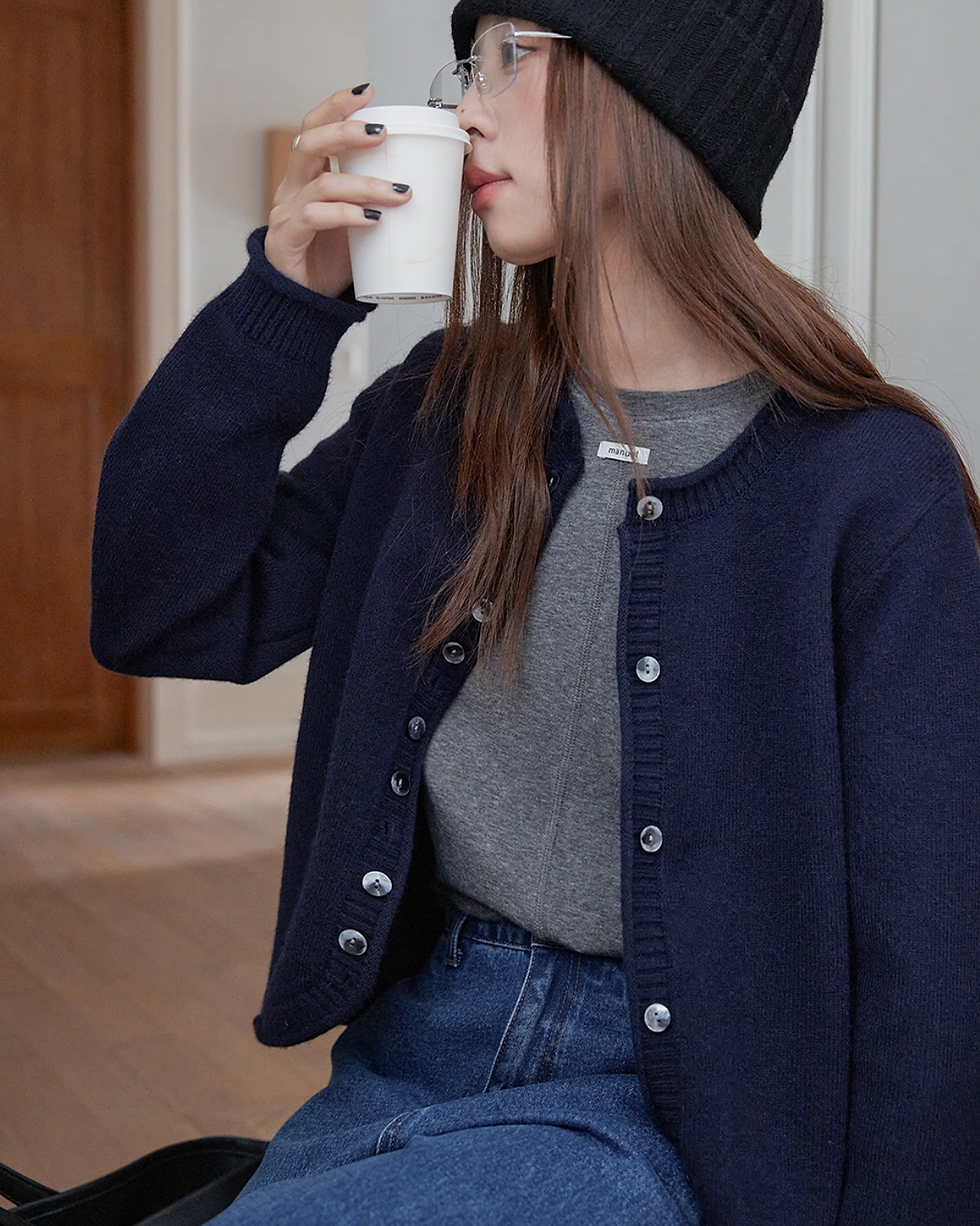 Wavy roll trimmed crewneck buttoned extra fine wool nylon knitted cardig
